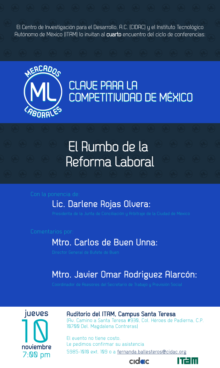 El Centro de Investigación para el Desarrollo, A.C. (CIDAC) y el Instituto Tecnológico Autónomo de México (ITAM) lo invitan a la cuarta conferencia del ciclo Mercados Laborales: Clave para la Competitividad de México.