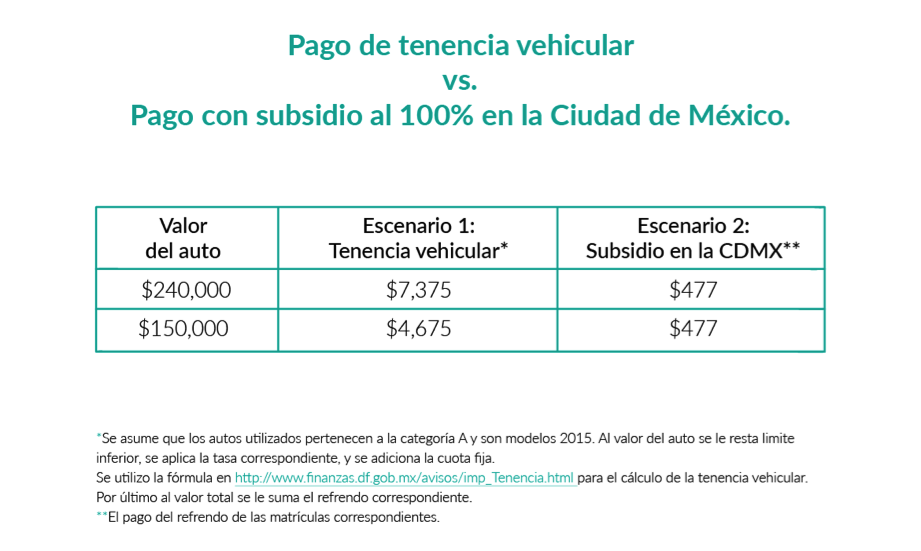 Desde hace algunos años, el Gobierno de la CDMX se ha caracterizado por impulsar políticas públicas de movilidad con objetivos y enfoques contrapuestos y, en ocasiones, contrarios. El privilegiar políticas de corto plazo como los subsidios a los impuestos vehiculares, que son redituables en términos electorales, han generado un esquema de incentivos desarticulados y poco eficientes para mejorar la movilidad de los ciudadanos y el bienestar ambiental. El caso del impuesto por la tenencia vehicular es particularmente interesante. Por un lado, el objetivo de este impuesto es elevar los costos de adquirir un vehículo propio que, en consecuencia, reduciría el aumento del número de autos de la ciudad. Sin embargo, el propósito de este impuesto se ha visto mermado gracias a la aprobación de medidas contrarias al mismo. Desde el año 2011 en algunas de las entidades federativas de la zona metropolitana opera el programa de subsidio a la tenencia del 100% durante los tres primeros meses del año. En el caso de la CDMX, este subsidio aplica a aquellos vehículos con valor de hasta 250 mil pesos sin adeudos, mientras que en el Estado de México el refrendo es para aquellos vehículos de entre 100 mil hasta 350 mil pesos. Como demuestra Tabla 1, a diferencia de la tenencia, cuyo monto depende del valor total del vehículo, el subsidio en la CDMX es constante para todos los autos, y por lo tanto, funciona como un incentivo para adquirir un vehículo particular.