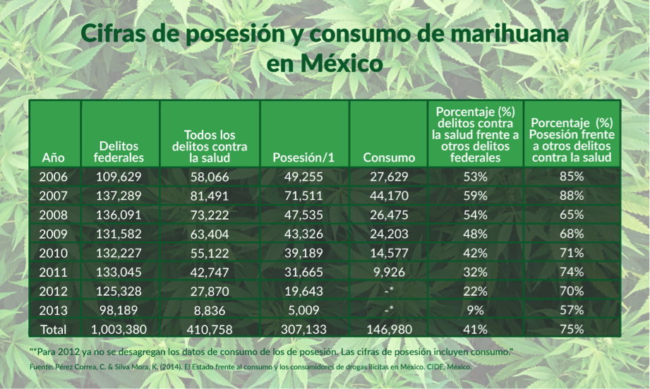 Como primer paso es necesario revisar la regulación vigente en materia de drogas, particularmente en el caso específico de la marihuana. El consumo de marihuana y, de hecho, de cualquier otra droga ilegal, no se encuentra tipificado como delito en México[5]. Sin embargo, sí lo están todas aquellas conductas vinculadas y necesarias para su consumo, llámese posesión, producción, transporte, tráfico, comercio, suministro, prescripción, financiamiento, supervisión, fomento, y publicidad o propaganda. En la práctica esto resulta en la imposibilidad de consumir marihuana sin cometer algún tipo de conducta penalizada. Entre 2009 y 2014 en México fueron detenidas 176 mil personas por posesión y 156 mil más por consumo[6]. En 2014 las detenciones por posesión y consumo representaron el 65% de las detenciones federales por delitos de drogas[7]. De acuerdo con los datos más recientes disponibles del sistema penitenciario, el 62% de la población carcelaria en 2012 estaba sentenciada por delitos de drogas y el 58.7% de éstos fueron sentenciados por actividades vinculadas con la marihuana[8]. En este contexto, aunque el consumo no se encuentra penalizado, los consumidores detenidos son procesados penalmente como narcomenudistas[9].