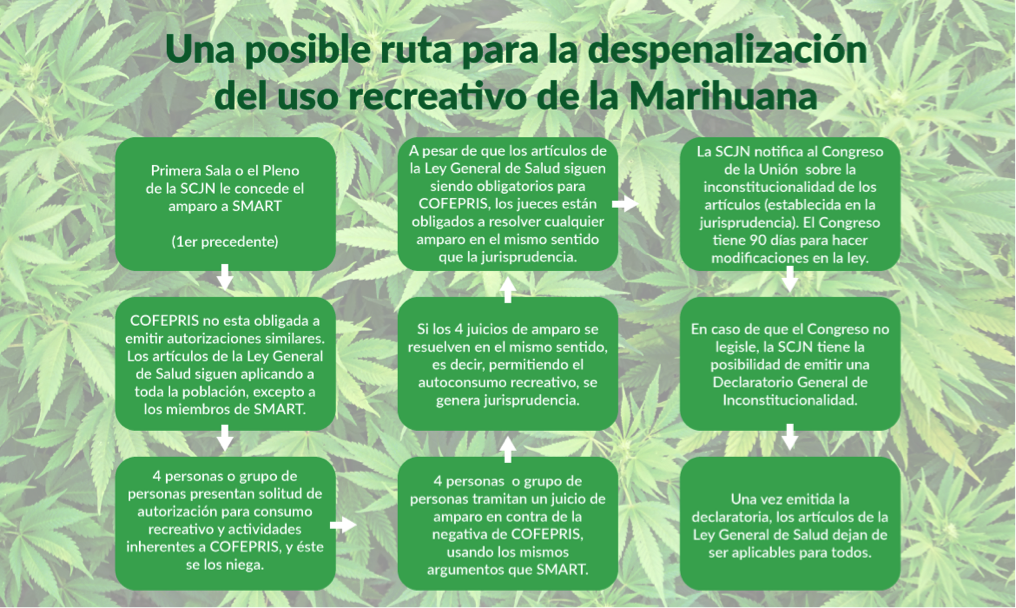El próximo miércoles 4 de noviembre está programado que la Primera Sala[1] de la Suprema Corte de Justicia de la Nación (SCJN) resuelva el amparo indirecto en revisión 237/2014[2], asunto que ha evocado el debate público sobre la despenalización del uso de la marihuana en nuestro país. El amparo fue promovido por la asociación civil Sociedad Mexicana de Autoconsumo Responsable y Tolerable A.C. (SMART)[3] ante la negativa de la Comisión Federal para la Protección contra Riesgos Sanitarios (COFEPRIS) para que sus miembros pudieran producir y consumir marihuana de forma lúdica y sin fines de lucro. En el proyecto, elaborado por el Ministro Arturo Zaldívar, se determina que ciertos artículos de la Ley General de Salud[4] que prohíben algunas actividades relacionadas con drogas ilegales son inconstitucionales. La sentencia haría que la negativa por parte de la COFEPRIS quedara sin efectos y posibilitaría el consumo recreativo de la marihuana. El proyecto del Ministro Zaldívar ha provocado un amplio debate sobre el paradigma prohibicionista vigente y las posibilidades de un mercado legal de marihuana en México. Sin embargo, las implicaciones que tendría esta decisión de la Corte, en el corto y mediano plazo, en la creación de un mercado legal de marihuana en México son más limitadas de lo que se ha discutido hasta el momento.