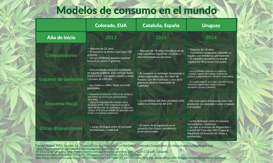 Los argumentos del Ministro Zaldívar giran en torno al derecho humano de libre desarrollo de la personalidad, cuyo pleno ejercicio se vería restringido ante la prohibición del consumo de marihuana. De acuerdo con los argumentos del Ministro, la prohibición vigente es una medida innecesaria y desproporcionada al existir alternativas regulatorias que afectan en un menor grado el derecho al libre desarrollo de la personalidad que el actual enfoque prohibicionista. Ejemplos de estas alternativas se pueden observar en España, Uruguay o algunos estados de Estados Unidos (Ver Tabla 2). Además de restringir la capacidad del Estado para interferir en la vida privada de las personas, el proyecto del ministro Zaldívar reconoce al consumo de marihuana como un tema de salubridad y resalta la obligación del Estado de garantizar la salud pública[11]. En este sentido, dicho proyecto es congruente con el debate reciente en la materia que insiste en abandonar la idea de que las drogas son un tema de seguridad pública para abordarlos como un asunto de salud[12].