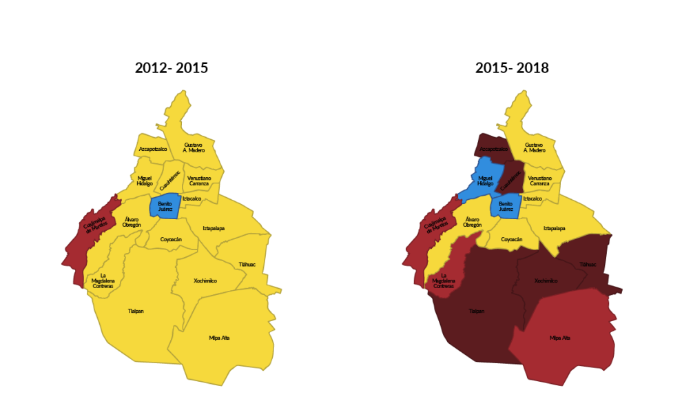 Las pasadas elecciones de junio de este año demostraron la forma en que el mal desempeño de Mancera, así como el desgaste del PRD a nivel local, contribuyeron a que el partido del sol azteca recibiera uno de los peores resultados electorales en su bastión capitalino. El PRD perdió 8 de 14 delegaciones y 18 asientos en la ALDF, cediendo la mayoría simple a MORENA (ver Ilustración 1 y 2).