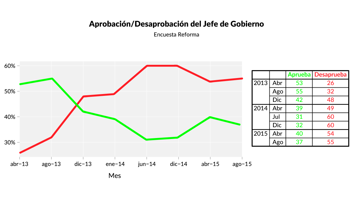 En 2012, Miguel Ángel Mancera obtuvo uno de los triunfos más contundentes en la elección de Jefe de Gobierno al obtener el 63.6% de los votos. Además, contaba con una Asamblea Legislativa del Distrito Federal (ALDF) con mayoría de miembros del Partido de la Revolución Democrática y la mayoría de las delegaciones de la capital eran controladas por el mismo partido. En vista de su posición privilegiada en una de las entidades con mayor peso político en el país, este escenario presentaba las condiciones idóneas para su proyección y consolidación como figura política – como lo hicieron sus antecesores Andrés Manuel López Obrador y Marcelo Ebrard – de cara a las elecciones de 2018. A tres años del inicio de su gestión, Mancera se encuentra en una posición diametralmente distinta: una asamblea sin mayoría del partido que lo llevó al poder y con índices de aprobación menores al 40% (ver Gráfica 1).