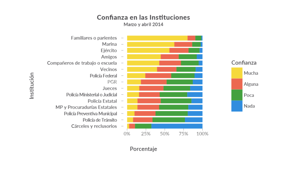 En última instancia el receptáculo de las equivocaciones institucionales –tanto en el ámbito de la comunicación como en el desempeño de las funciones sustantivas- es la opinión pública. No sorprende que la cifra negra en el país (porcentaje de delitos que no se denuncian) se ubique en un 93.8% y en ninguna entidad del país sea menor al 83.6%. De acuerdo con la Encuesta Nacional de Victimización y Percepción de Seguridad Pública 2014 (ENVIPE 2014), el 18.5% de los ciudadanos no tiene nada de confianza en las Procuradurías de Justicia Estatales y el 38.1% tiene poca confianza, por lo tanto 1 de cada 2 ciudadanos no confía en las procuradurías locales. La dinámica de la opinión pública ante fenómenos sociales como el crimen es de suma importancia, pues determina comportamientos ante las instituciones públicas. Por ejemplo, los motivos detrás de la cifra negra son las expectativas de las personas hacia las instituciones y, en concreto, la reticencia a denunciar por considerarlo inútil y/o por miedo a represalias.